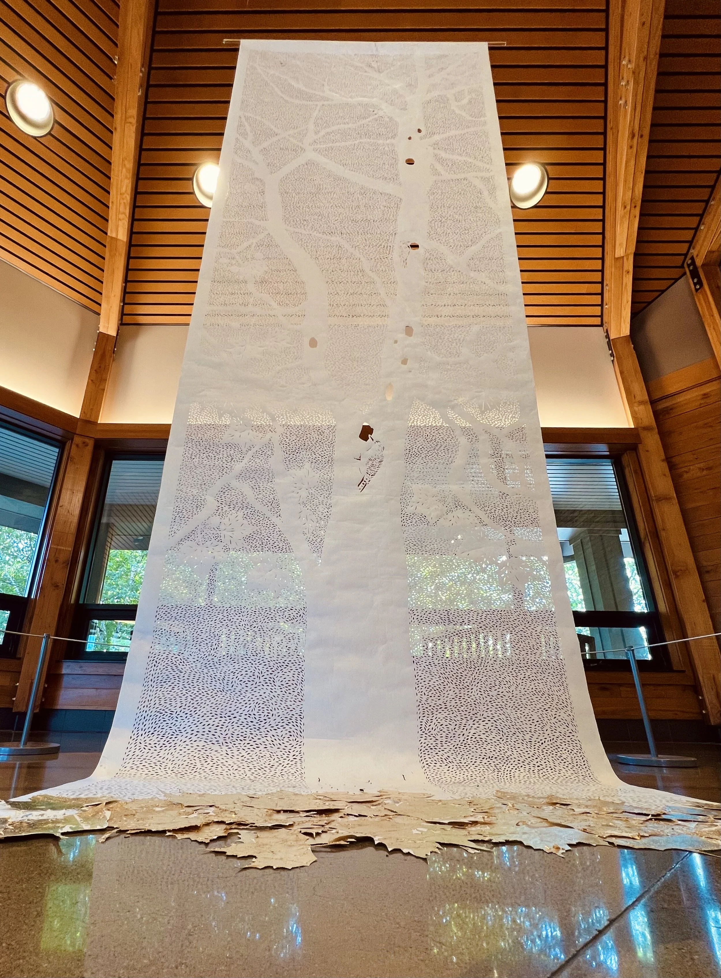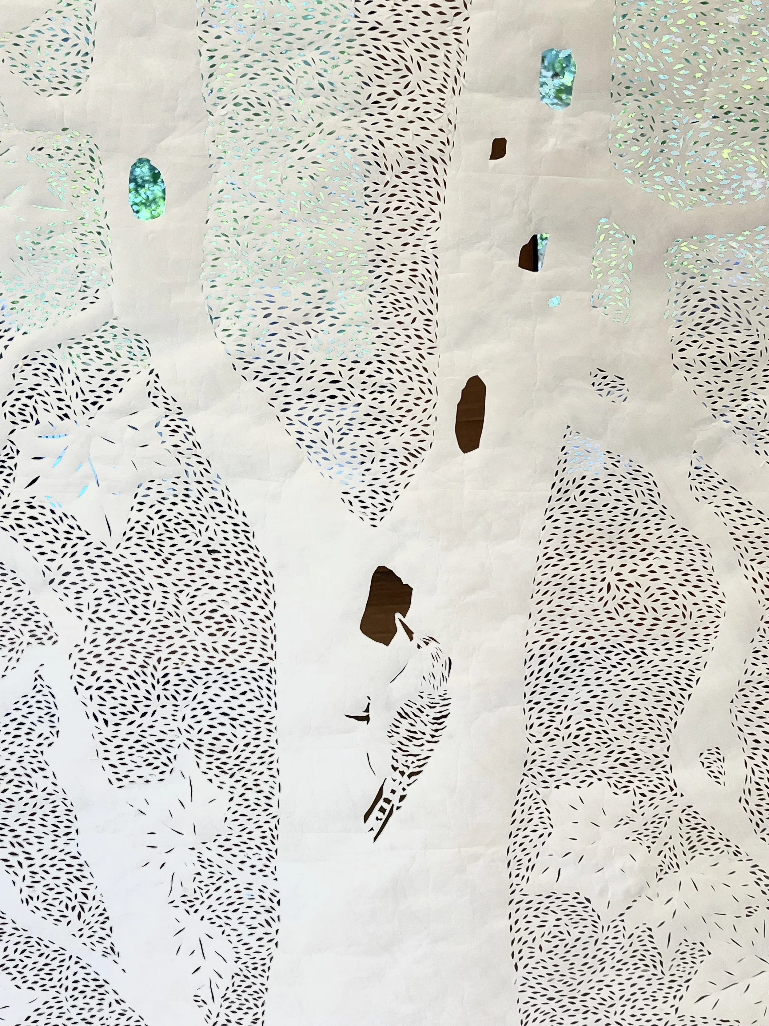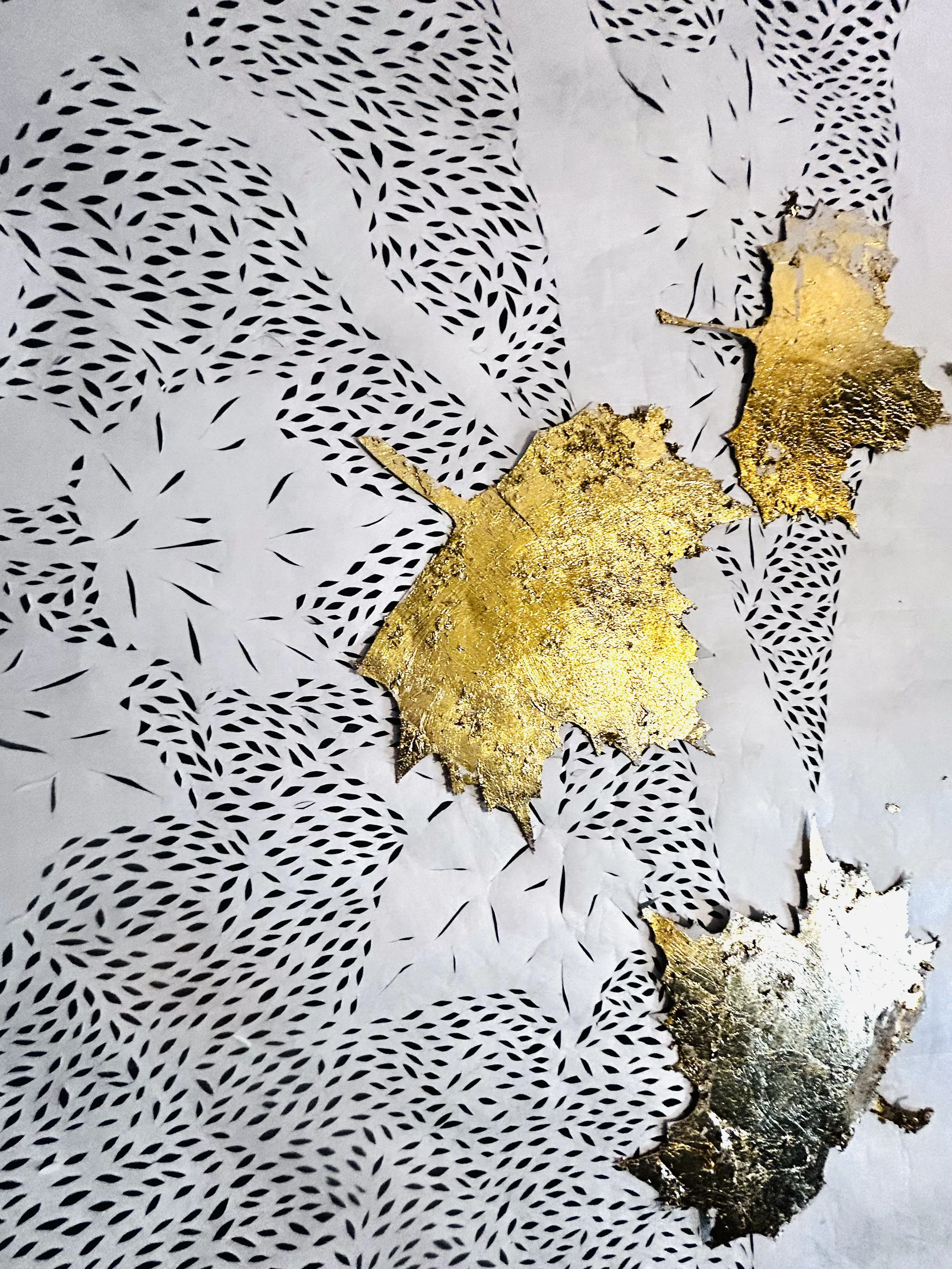 Hand- cut Tyvek, plastic rod, gold leaf, paper, glue