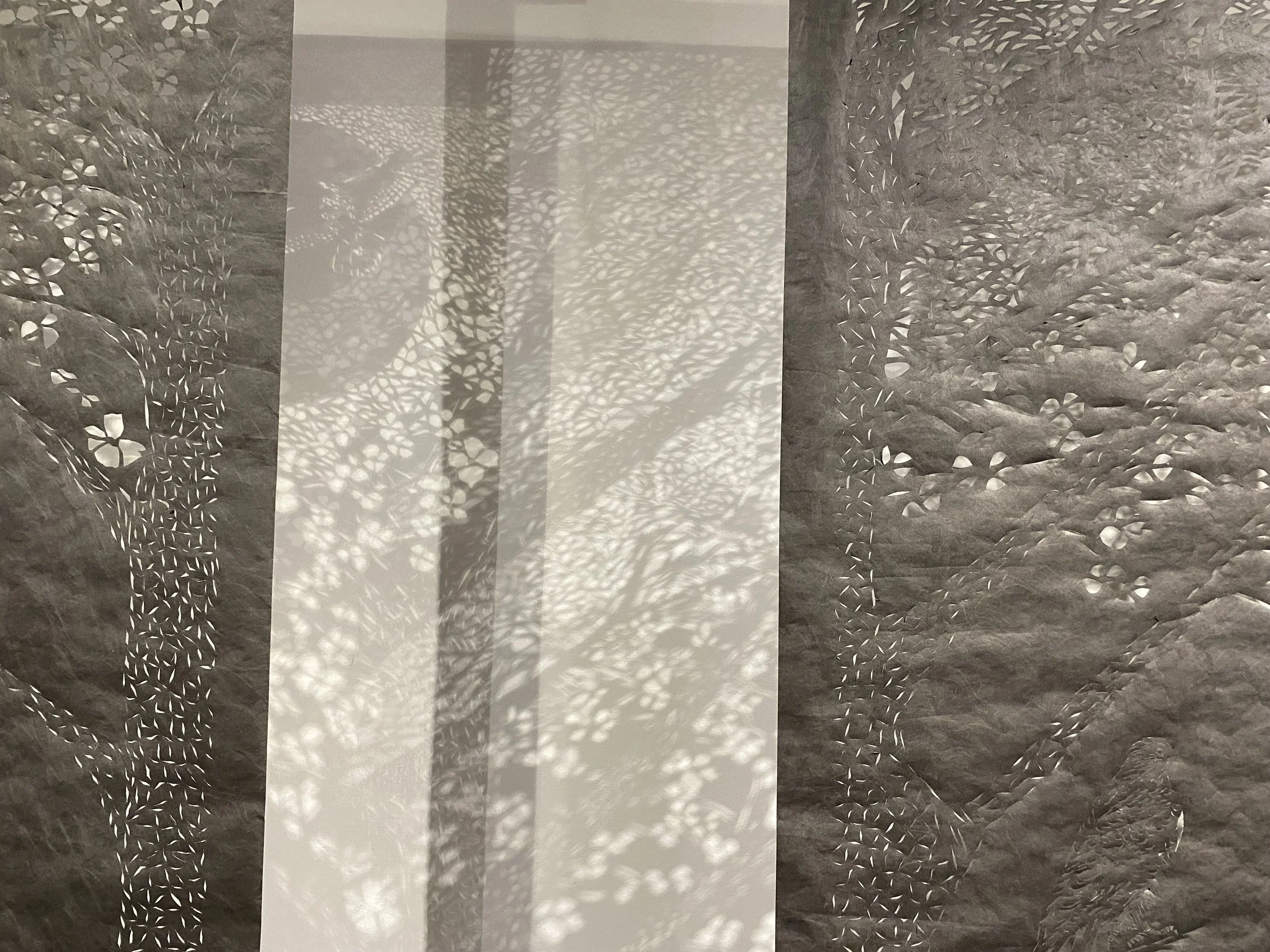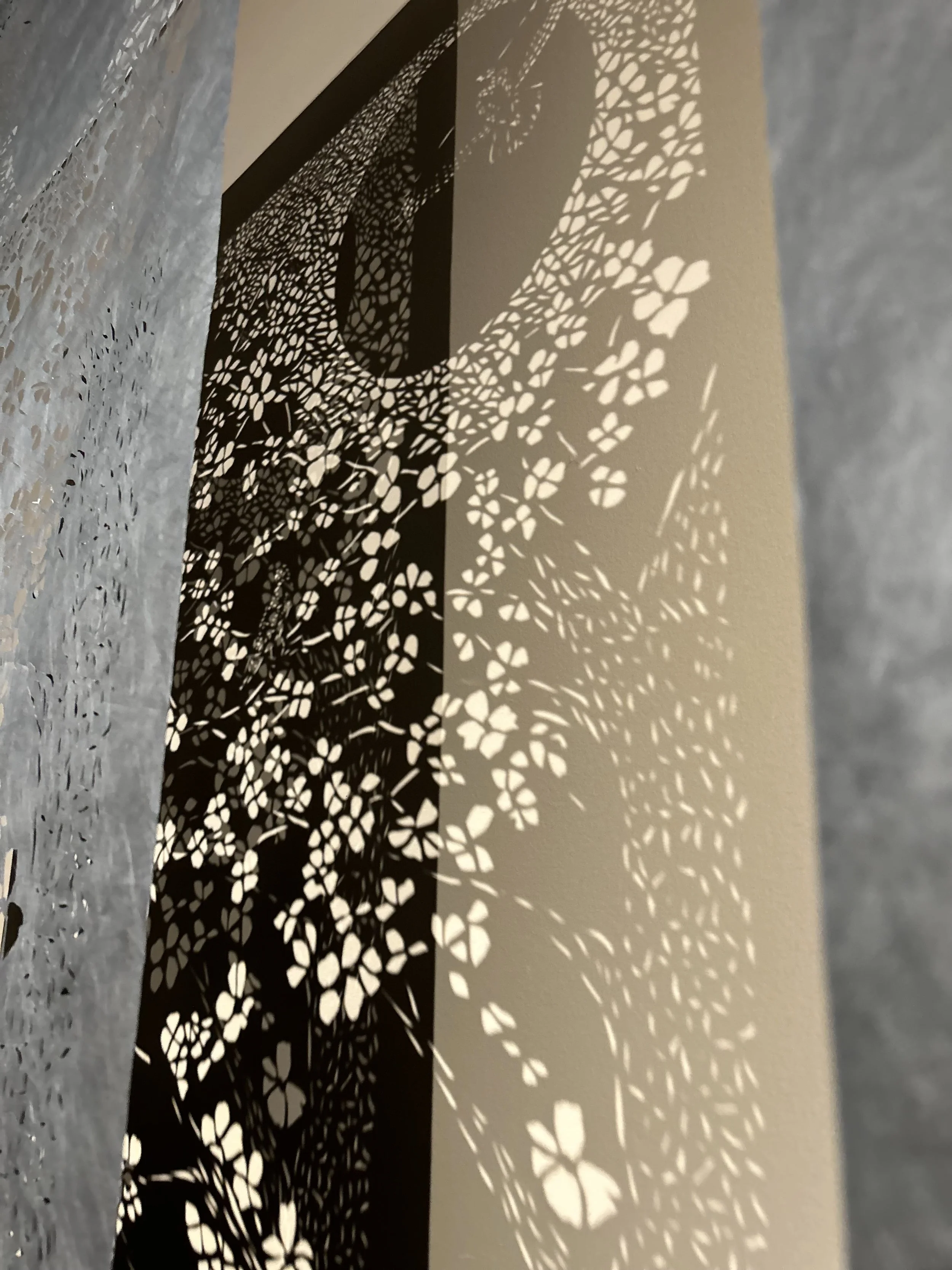 This work is inspired by traditional Jewish paper cuts. Jewish art reveals universal elements in its visual representation of animals. Animals in pairs, utilizing symmetry is said to underline the balance of creation. The Tree of Life was a widespread visual symbol in ancient Mediterranean civilizations. The tree represents life, death, resurrection, maternal attributes, the life cycle. In Jewish myth, the tree is the symbol of creation, the Torah, and eternal life.